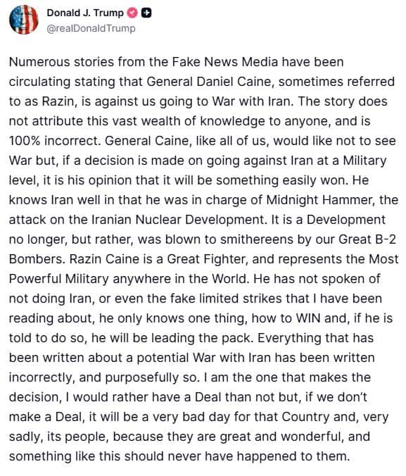 “Razin” olarak da bilinen General Caine’in “harika bir savaşçı olduğunu” ve “dünyanın en güçlü ordusunu temsil ettiğini” kaydeden Trump, “O, İran’a saldırmamaktan ya da basından okuduğum sahte kapsamı sınırlı saldırılardan bahsetmedi. O sadece kazanmayı bilir ve eğer kendisine söylenirse, buna önderlik edecektir” ifadelerini kullandı. İran ile muhtemel savaş senaryolarını ele alan haberlerin gerçeği yansıtmadığını ve kasıtlı olarak yanlış yazıldığını savunan Trump, “Kararı veren kişi benim. Ben bir anlaşma olmasını, olmamasına tercih ederim. Ancak bir anlaşmaya varamazsak, bu İran ve ne yazık ki halkı için çok kötü bir gün olur. Çünkü İran’ın halkı harika ve iyi insanlar ve böyle bir şeyin onların başına asla gelmemesi gerekir” dedi.
