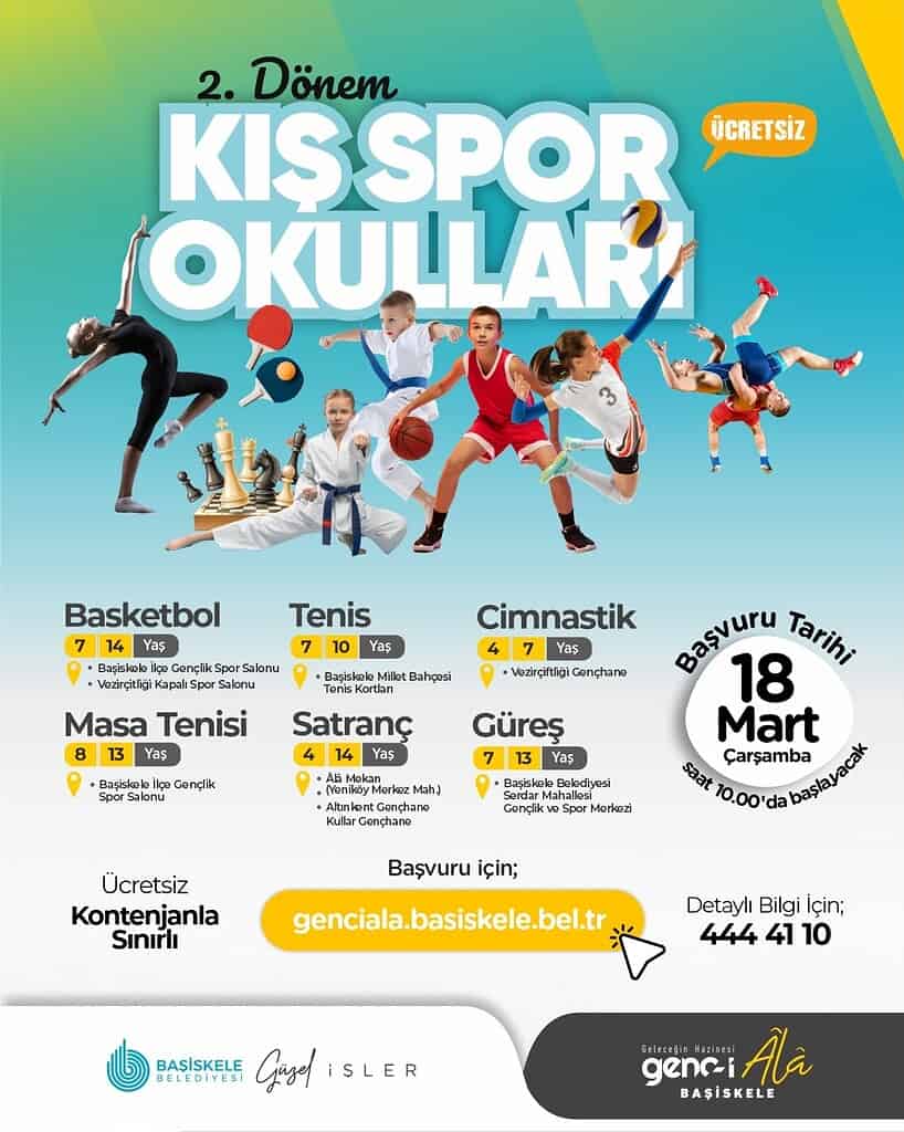 Başiskele Belediyesi tarafından düzenlenen kış spor okullarında, her çocuğun ilgi alanına hitap edecek geniş bir yelpaze sunuluyor. Genç yetenekler; basketbol, masa tenisi, karate, voleybol, yüzme, cimnastik, satranç, güreş ve tenis branşlarında kendilerini geliştirme imkanı bulacak. Eğitimler, çocukların hem sosyalleşmesini hem de erken yaşta spor disiplini kazanmasını hedefliyor.
