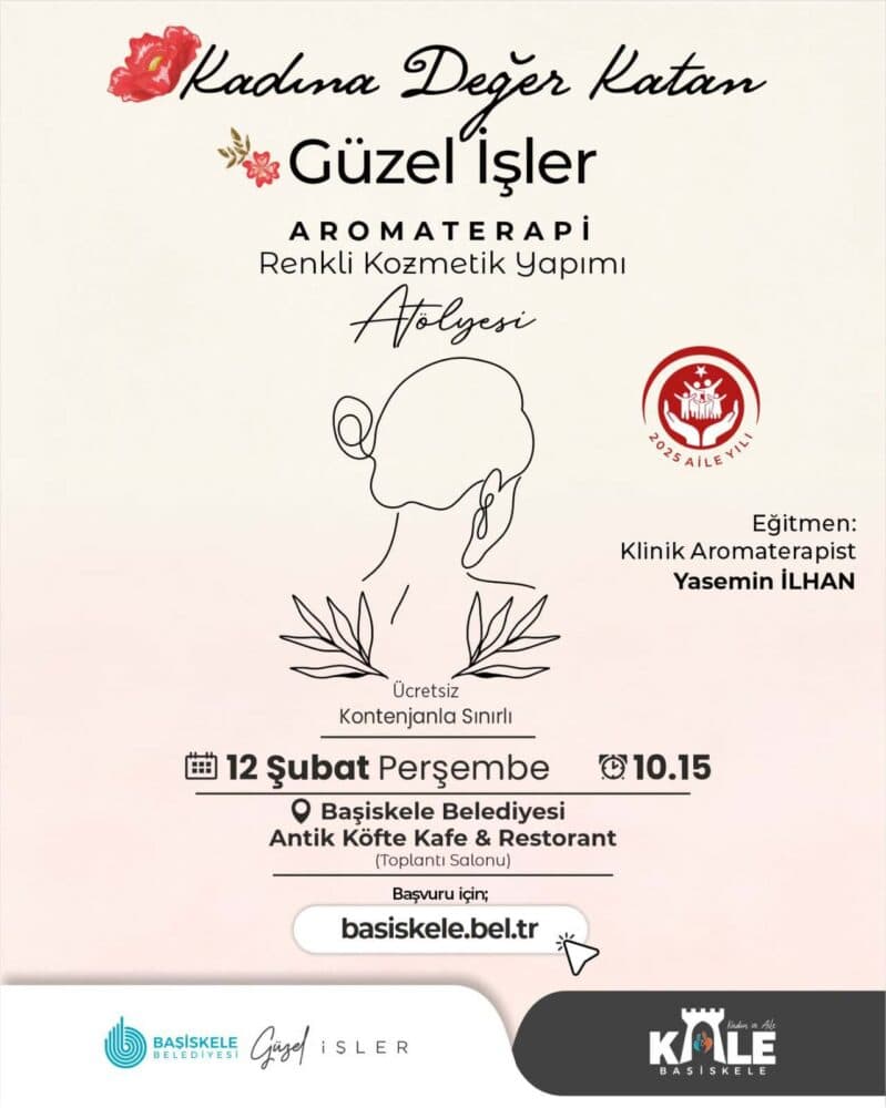 Kadınlara değer katan projelerle dikkat çeken Başiskele Belediyesi, bu atölyeyi tamamen ücretsiz olarak vatandaşların hizmetine sunuyor. Katılımcılar, uzman eğitmenler eşliğinde aromaterapinin keyifli dünyasını keşfederken aynı zamanda kendi üretimlerini yapmanın mutluluğunu yaşayacak.