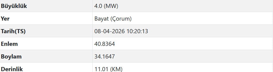 Çorum’un Bayat ilçesinde 8 Nisan 2026 saat 10.20’de 4.0 büyüklüğünde bir deprem meydana geldi. AFAD depremin derinliğini 11.01 km olarak duyurdu.