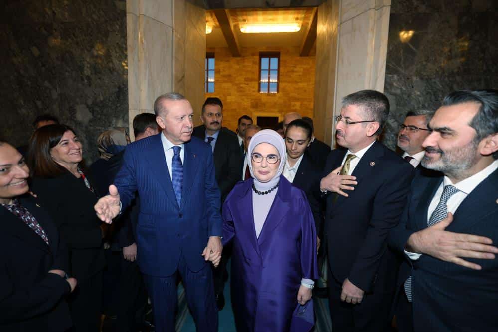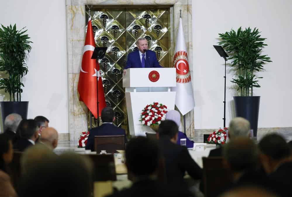 Türkiye’nin terör sorunundan kurtulması gerektiğini ve bu süreci baltalamak isteyenlerin olacağını belirten Erdoğan, “Şurası bir gerçek ki dün olduğu gibi yarın da bu süreci hazmedemeyenler, Türkiye’yi girdiği bu yoldan geri döndürmek isteyenler, bu hayırlı süreci var güçleriyle engellemeye çalışanlar olacaktır. Biz bunlara aldırmayacağız. Doğru bildiğimiz yolda emin, kararlı ve cesur adımlarla ilerleyeceğiz. Bu fırsatı, bu imkanı heba etmeyecek, heba edilmesine izin vermeyeceğiz. AK Parti ve Cumhur İttifakı olarak Meclisteki diğer siyasi partilerimizin de müspet katkılarıyla sürecin menziline varması için sorumluluk duygusuyla hareket edeceğiz. Yaklaşık yarım asırdır milletimizin ayağına bağ olan, on binlerce vatandaşımızın canını yakan, nice annenin yüreğine ateşler düşüren, ülkemize ekonomik maliyeti 2 trilyon doları aşan bu musibetten Türkiye’yi inşallah kurtaracağız. Bunu da kardeşlik hukuku içinde, vatandaşlık hukuku içinde, şehitlerimizin ruhlarını muazzep etmeden, gazilerimizi ve şehit yakınlarımızı müteessir etmeden meşru ve makul bir zeminde gerçekleştireceğiz. Aynı hassasiyeti, aynı özgüvenli ve yapıcı yaklaşımı bu çatı altındaki her bir milletvekilinden, tüm siyasi partilerden beklediğimizi bir kez daha vurgulamak istiyorum. İnşallah Türkiye bu meseleyi kalıcı olarak geride bıraktığında çok farklı bir atmosfer yakalayacak, kabına sığmayacak, ağır yüklerinden kurtulmuş bir şekilde aydınlık yarınlarına doğru koşar adım gidecektir” dedi.