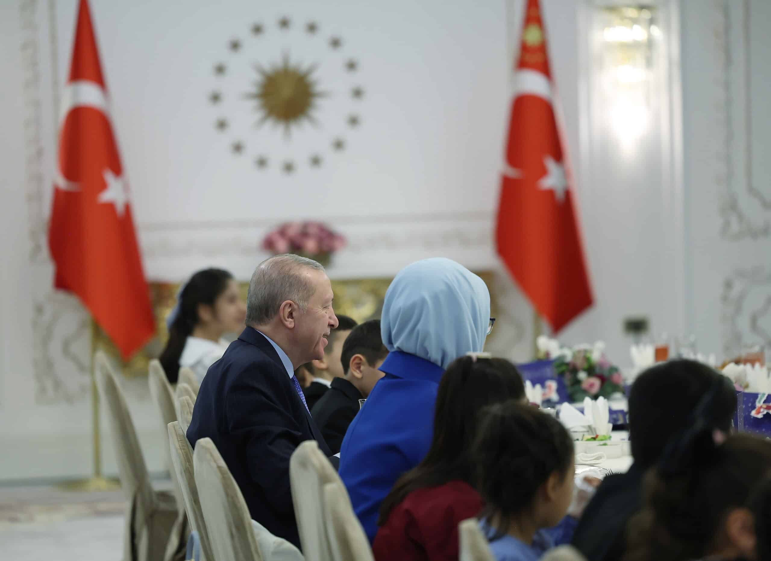 Cumhurbaşkanı Recep Tayyip Erdoğan ve eşi Emine Erdoğan, devlet himayesi altındaki çocuklarla iftar sofrasında bir araya geldi. Buluşmada neşeli anlar yaşanırken çocukların yazdıkları mektuplarda, “Tayyip amca, Emine teyze, sizinle iftar açmak çok güzel. Sayenizde sıcacık yuvalarda kalıyoruz, sevgiyle büyüyoruz” ifadeleri yer aldı.