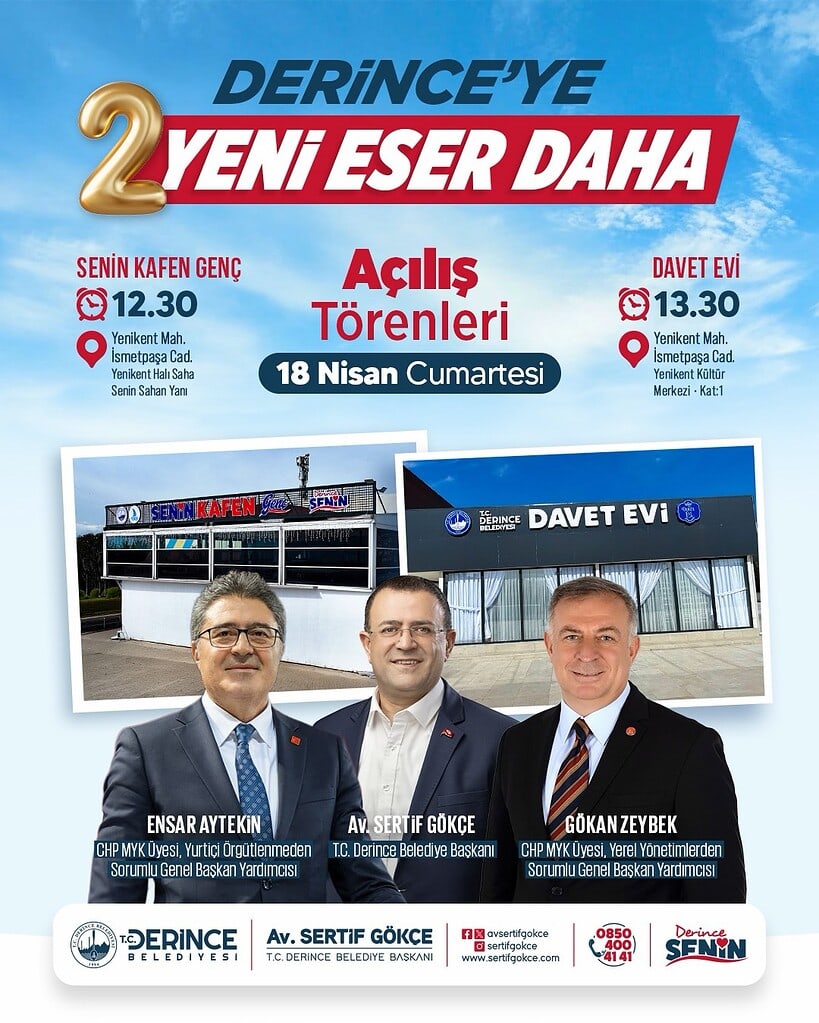 Derince Belediyesi, ilçenin sosyal dokusuna dokunan ve vatandaşların yaşam kalitesini artıracak iki önemli vizyon projesini daha tamamlayarak hizmete açıyor. Belediye Başkanı Sertif Gökçe’nin seçim vaatleri arasında yer alan ve kısa sürede hayata geçirilen “Senin Kafen Genç” ve “Davet Evi”, 18 Nisan Cumartesi günü düzenlenecek görkemli törenlerle halkla buluşacak.