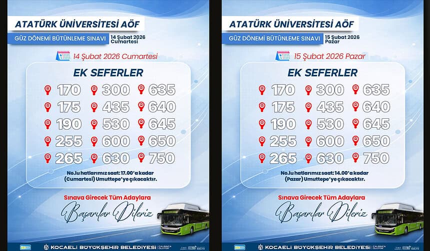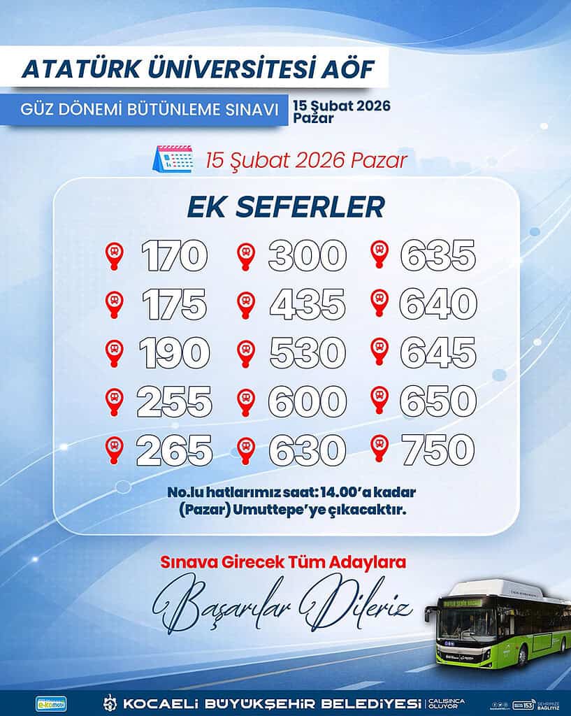 Kocaeli Büyükşehir Belediyesi, 14-15 Şubat tarihlerinde gerçekleştirilecek Atatürk Üniversitesi Açıköğretim Fakültesi (AÖF) Güz Dönemi Bütünleme Sınavı dolayısıyla ulaşıma ek seferler dahil etti. Sınav günü oluşabilecek yoğunluğu önlemek adına hareket geçen ulaşım ekipleri, özellikle Kocaeli Üniversitesi Umuttepe Kampüsü’ne gidecek öğrenciler için sefer sayılarını artırdı.