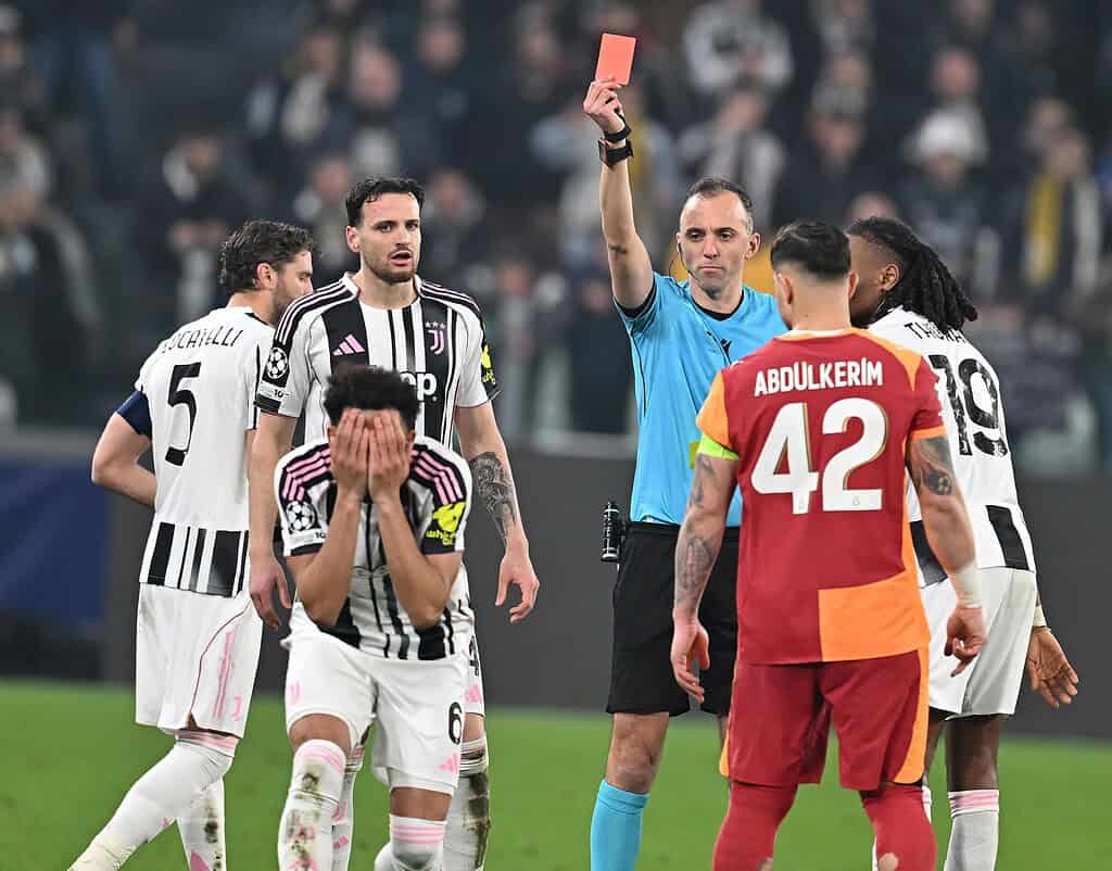 epa12777084 Juventus’ Lloyd Kelly reacts as he is expelled during the UEFA Champions League soccer match Juventus FC vs Galatasaray SK a at the Allianz Stadium in Turin, Italy, 25 February 2026 EPA/Alessandro Di Marco