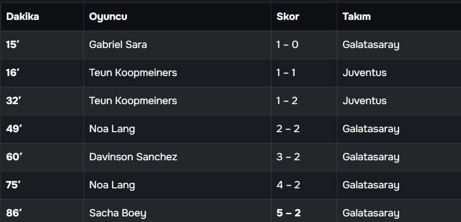 Sayısal avantajı ve moral üstünlüğünü iyi değerlendiren Galatasaray, 75. dakikada gecenin yıldızı Noa Lang’ın ikinci golüyle farkı ikiye çıkardı. Maçın sonucunu belirleyen vuruş ise 86. dakikada sağ bek Sacha Boey’den geldi. Ceza sahasına giren Boey, Juventus filelerini havalandırarak skoru 5-2’ye taşıdı.