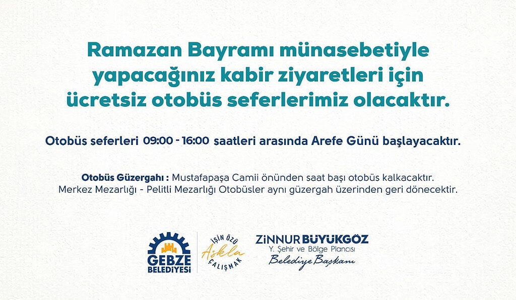 Gebze Belediyesi, Ramazan Bayramı öncesinde vatandaşların kabir ziyaretlerini daha kolay gerçekleştirebilmesi için ücretsiz otobüs seferleri planladığını duyurdu. Arefe Günü mezarlık ziyaretlerini gerçekleştirecek Gebzeliler için ücretsiz ulaşım desteği sağlanıyor; seferler sabah saat 09:00’da başlıyor.
