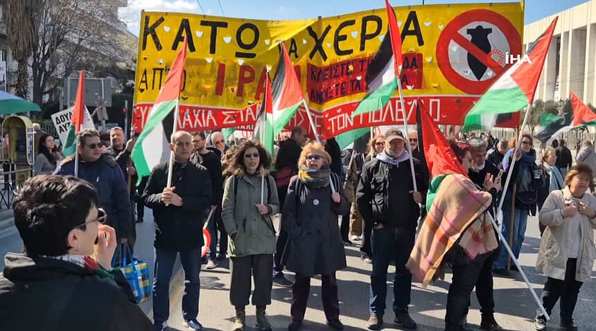 Yunanistan’ın başkenti Atina’da işçi sendikaları ve sivil toplum örgütleri, ABD Büyükelçiliği’ne doğru dev bir yürüyüş gerçekleştirdi. “Orta Doğu’yu kana buluyorlar” sloganları atan göstericiler, Yunan hükümetinden ABD ve İsrail’e lojistik destek vermemesini talep etti. Protestocular, saldırıların asıl amacının enerji yollarını kontrol etmek olduğunu iddia etti.