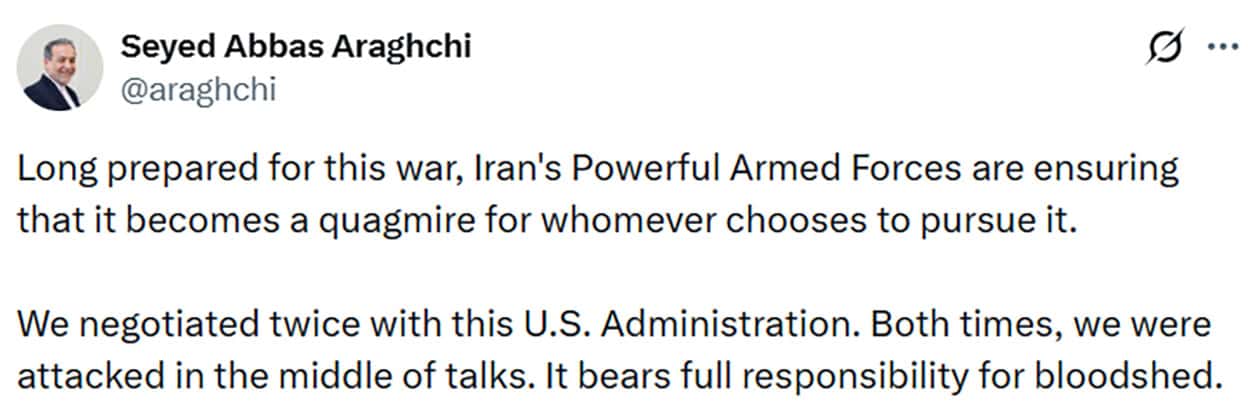 İran Dışişleri Bakanı Abbas Arakçi, sosyal medya hesabından ABD ve İsrail’in ülkesine yönelik saldırıları ile ilgili açıklamalarda bulundu. İran ordusunun düşmanlarına karşı kararlı bir şekilde mücadele ettiğini belirten Arakçi, “Bu savaş için uzun süredir hazırlıklı olan İran’ın güçlü silahlı kuvvetleri, savaşın onu seçenler için bir bataklığa dönüşmesini sağlıyor” dedi. İran’ın diplomasi çabalarının sonuçsuz bırakıldığını vurgulayan Arakçi, “Mevcut ABD yönetimi ile iki kez müzakere ettik. Her iki seferde de görüşmelerin ortasında saldırıya uğradık. Akan kanın tüm sorumluluğu onlara aittir” ifadelerini kullandı.