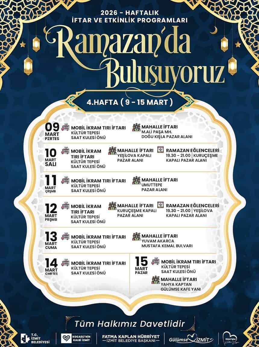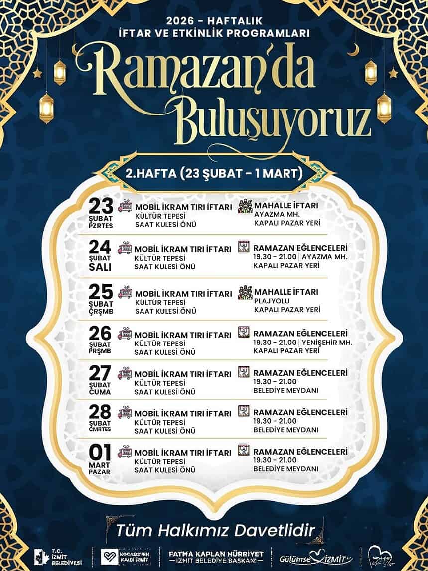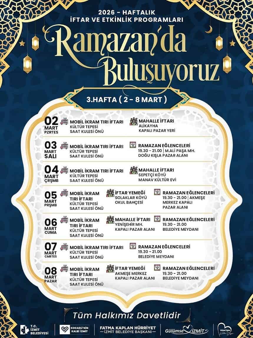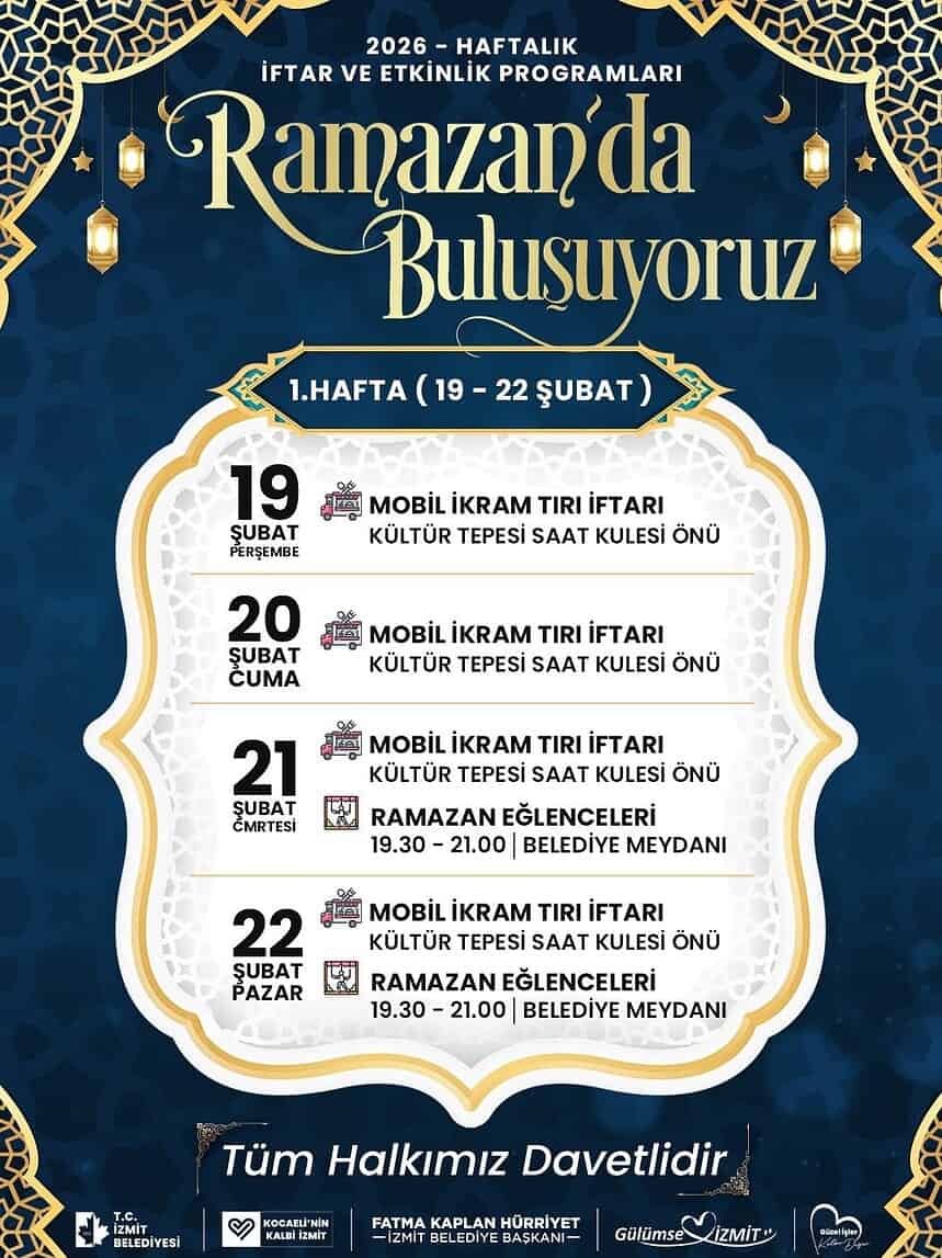 İzmit Belediyesi, on bir ayın sultanı Ramazan’ın bereketini ve huzurunu mahallelere taşıyor. “Soframız da sevincimiz de ortak” sloganıyla yola çıkan belediye, Ramazan ayı boyunca her hafta düzenleyeceği toplu iftar sofraları ve etkinliklerle İzmitlileri aynı çatı altında buluşturmaya hazırlanıyor.