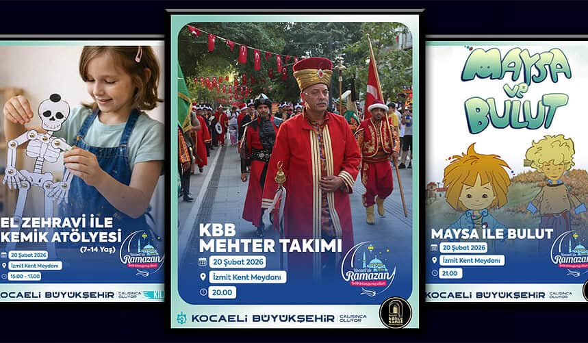 Kocaeli Büyükşehir Belediyesi, Ramazan ayının manevi atmosferini ve coşkusunu İzmit Kent Meydanı’nda düzenlenen birbirinden renkli etkinliklerle vatandaşlarla buluşturmaya devam ediyor. 20 Şubat Cuma günü için hazırlanan özel programda, çocuklar için eğitici atölyelerden geleneksel Mehter Takımı gösterisine kadar geniş bir yelpazede etkinlikler Kocaeli halkını bekliyor.