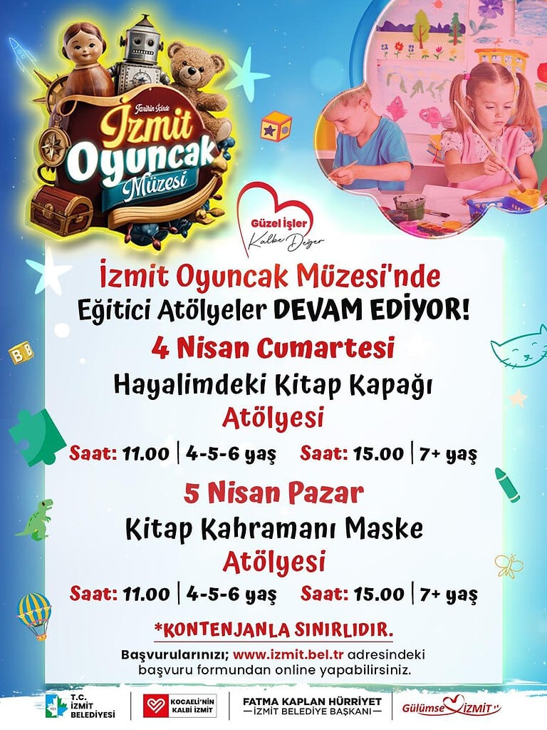 İzmit Belediyesi Oyuncak Müzesi’nde atölyeler devam ediyor. 30 Mart-5 Nisan Kütüphane Haftası’na özel 4 Nisan Cumartesi saat 11.00’de 4-5-6 yaş grubuyla saat 15.00’te ise 7 yaş grubuyla “Hayalimdeki Kitap Kapağı Atölyesi” gerçekleştirilecek. 20 kişilik kontenjan ayrılan atölyelerde akrilik boya, fırça, çeşitli süsleme malzemeleri ve fon kartonundan kalıplar kullanılacak. Çocuklar; renk, şekil, yazı ve görsel unsurları bir araya getirip hayal ettikleri bir hikayeyi düşünerek kendi kitap kapaklarını tasarlayacak.