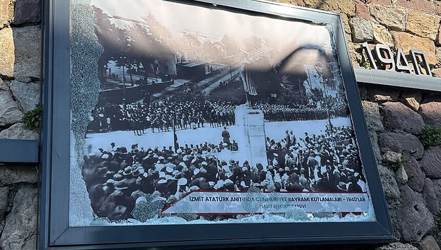 İzmit Tren Garı yolunda yer alan Atatürk ve Cumhuriyet temalı rölyeflere kimliği belirsiz kişiler tarafından zarar verildi. Gece saatlerinde gerçekleştirildiği düşünülen saldırıda, rölyefin önünde bulunan cam kırılarak parçalandı. Zarar verilen bölümde, 1940’lı yıllarda İzmit Atatürk Anıtı önünde gerçekleştirilen Cumhuriyet Bayramı kutlamalarına ait tarihi bir fotoğraf yer alıyor. Camın kırılmasıyla birlikte fotoğrafın bulunduğu alan da tahrip edildi.