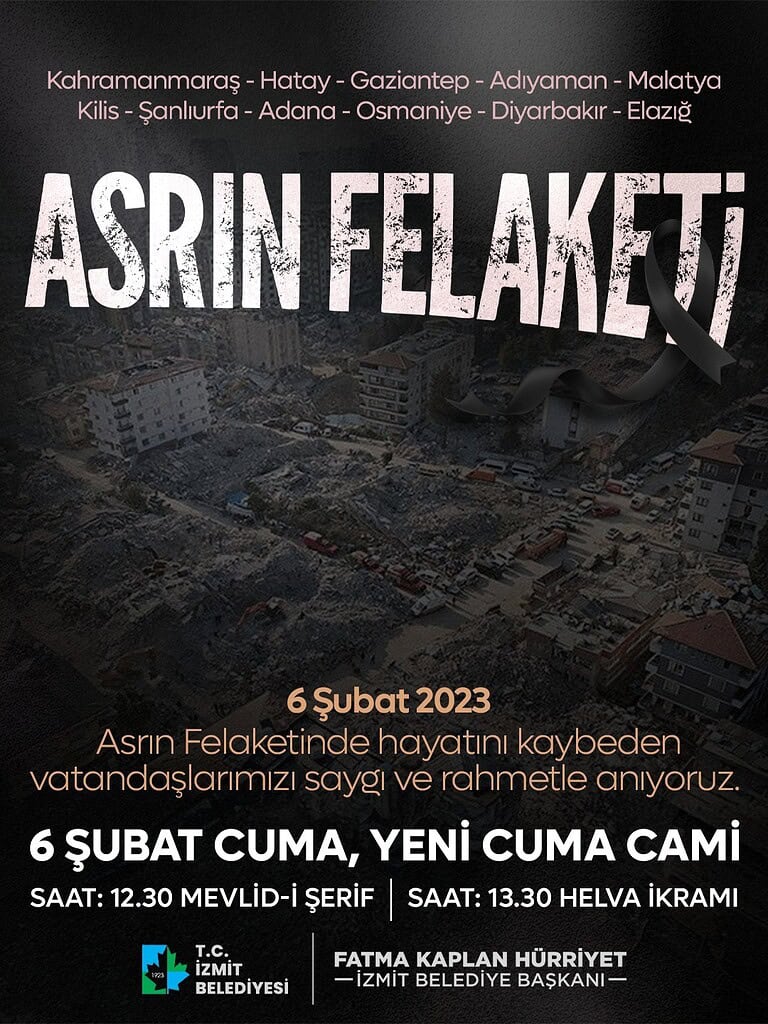 İzmit Belediyesi, 6 Şubat 2023 tarihinde Kahramanmaraş merkezli meydana gelen ve 11 ili etkileyen depremde hayatını kaybeden vatandaşları anmak amacıyla Mevlid-i Şerif programı düzenliyor. 6 Şubat Cuma günü (Yarın), Cuma Namazından önce Yeni Cuma Camii’nde depremde yaşamını yitiren vatandaşlar adına Mevlid-i Şerif okunacak. Programın ardından Yeni Cuma Camii bahçesinde vatandaşlara helva ikramı yapılacak.