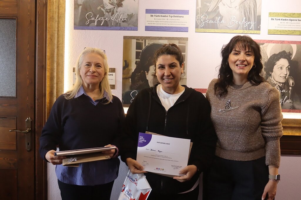 Zübeyde Hanım Konağı Kadın Yaşam Merkezi’nde gerçekleştirilen törende, 15 hafta süren eğitim sürecini başarıyla tamamlayan katılımcılar belgelerine kavuştu. Program süresince annelere; çocuk gelişimi, sağlıklı iletişim ve ebeveynlik becerileri gibi birçok alanda kapsamlı eğitimler verildi. Törende AÇEV gönüllü eğitmeni Seda Uğur ile İzmit Belediyesi Kadın ve Aile Hizmetleri Müdürü Burcu Bineklioğlu tarafından katılımcılara belgeleri takdim edildi.