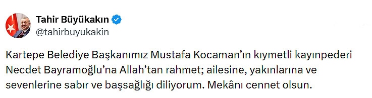 “Kartepe Belediye Başkanımız Mustafa Kocaman’ın kıymetli kayınpederi Necdet Bayramoğlu’na Allah’tan rahmet; ailesine, yakınlarına ve sevenlerine sabır ve başsağlığı diliyorum. Mekânı cennet olsun.”