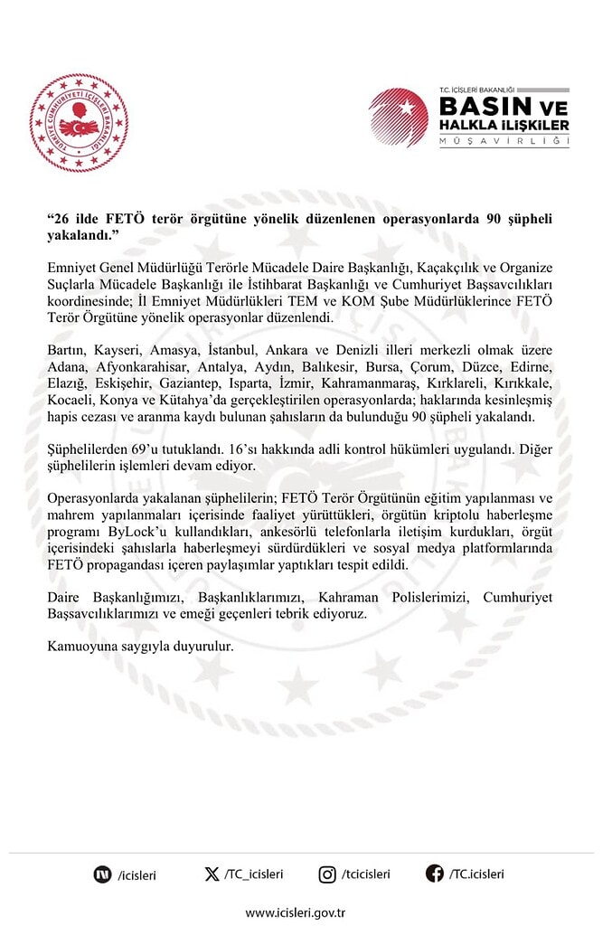 - Sosyal medya platformlarında FETÖ propagandası içeren paylaşımlar yapan 90 şüpheli yakalandı.