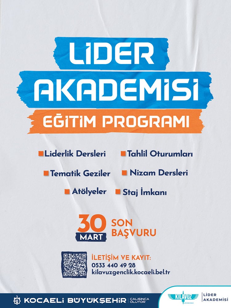 Kocaeli Büyükşehir Belediyesi, gençlerin vizyonunu büyütmek ve geleceğe daha donanımlı hazırlanmalarını sağlamak amacıyla düzenlediği “Lider Akademisi” Eğitim Programı’nın bahar dönemi kayıtlarını başlattı. Kendini geliştirmek ve liderlik becerileri kazanmak isteyen gençler için kapılarını açan Kocaeli Lider Akademisi, 30 Mart’a kadar Başvuruları kabul edecek.