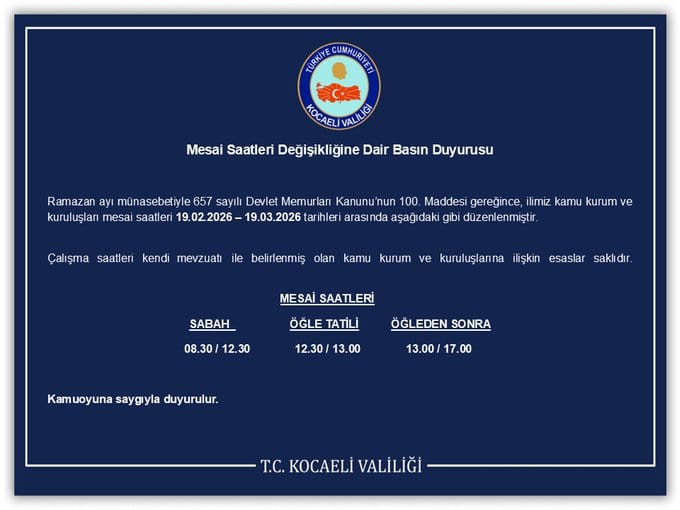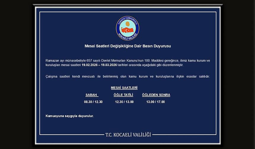 Kocaeli Valiliği, yaklaşan Ramazan ayı nedeniyle vatandaşların ve kamu personelinin durumunu gözeterek çalışma saatlerini yeniden düzenledi. Yapılan resmi açıklamaya göre, il genelindeki kamu kurumlarında uygulanacak olan yeni mesai programı 19 Şubat 2026 ile 19 Mart 2026 tarihleri arasını kapsayacak.