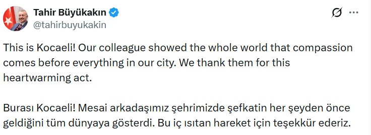 “This is Kocaeli! Our colleague showed the whole world that compassion comes before everything in our city. We thank them for this heartwarming act.