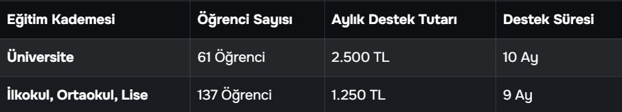 Program, ilkokul seviyesinden üniversiteye kadar geniş bir öğrenci grubunu kapsıyor. Destek alan 195 öğrencinin dağılımı ve ödeme detayları şu şekildedir:
