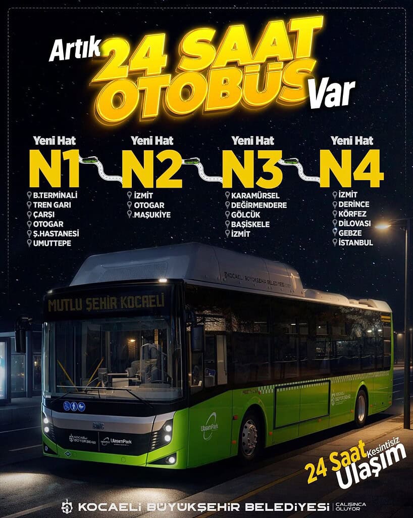 Kocaeli Büyükşehir Belediyesi, 9 Şubat itibarıyla N1, N2, N3 ve N4 gece hatlarını devreye alıyor. 24 saat kesintisiz ulaşım dönemi Kocaeli’de resmen başlıyor!