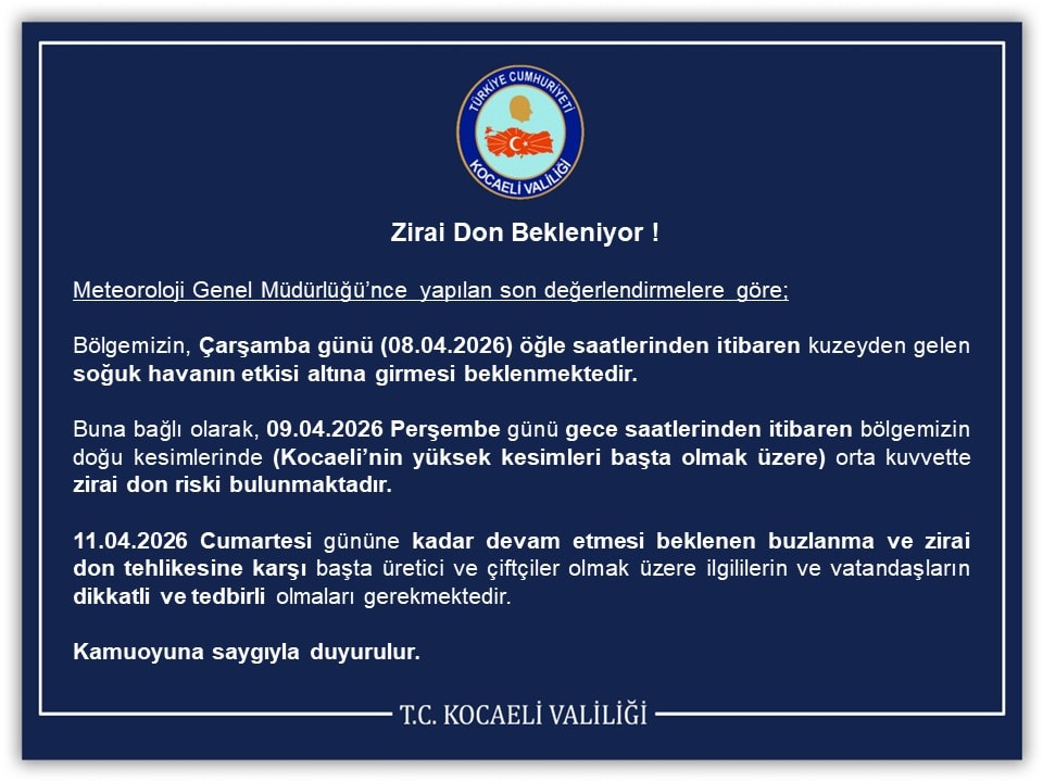 Buna bağlı olarak, 09.04.2026 Perşembe günü gece saatlerinden itibaren bölgemizin doğu kesimlerinde (Kocaeli’nin yüksek kesimleri başta olmak üzere) orta kuvvette zirai don riski bulunmaktadır.