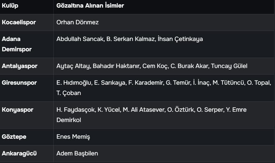 Soruşturma kapsamında gözaltına alınan isimlerin kulüplere göre dağılımı şu şekilde: