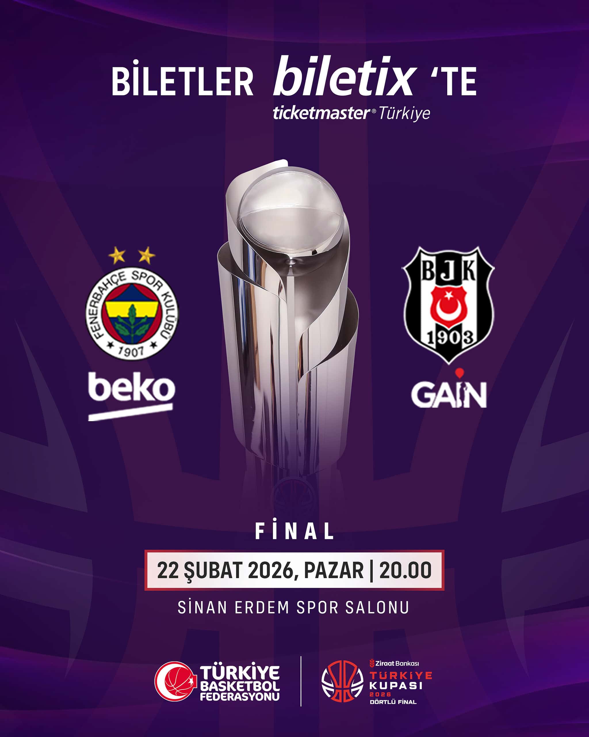 Türkiye Sigorta Basketbol Süper Ligi’nin ilk yarısında oynanan karşılaşmalar sonucunda ilk 8 sırada yer alan takımların mücadele ettiği Basketbol Ziraat Bankası Türkiye Kupası’nda, yarın final heyecanı yaşanacak. Sinan Erdem Spor Salonu’nda oynanacak Fenerbahçe Beko ile Beşiktaş arasındaki final karşılaşması yarın saat 20.00’de başlayacak. Dörtlü Final organizasyonunda Beşiktaş, A.Efes’i 91-82 mağlup ederek finale yükseldi. Diğer eşleşmede ise Fenerbahçe Beko, Türk Telekom’u 86-78’lik skorla yendi ve adını finale yazdırdı.