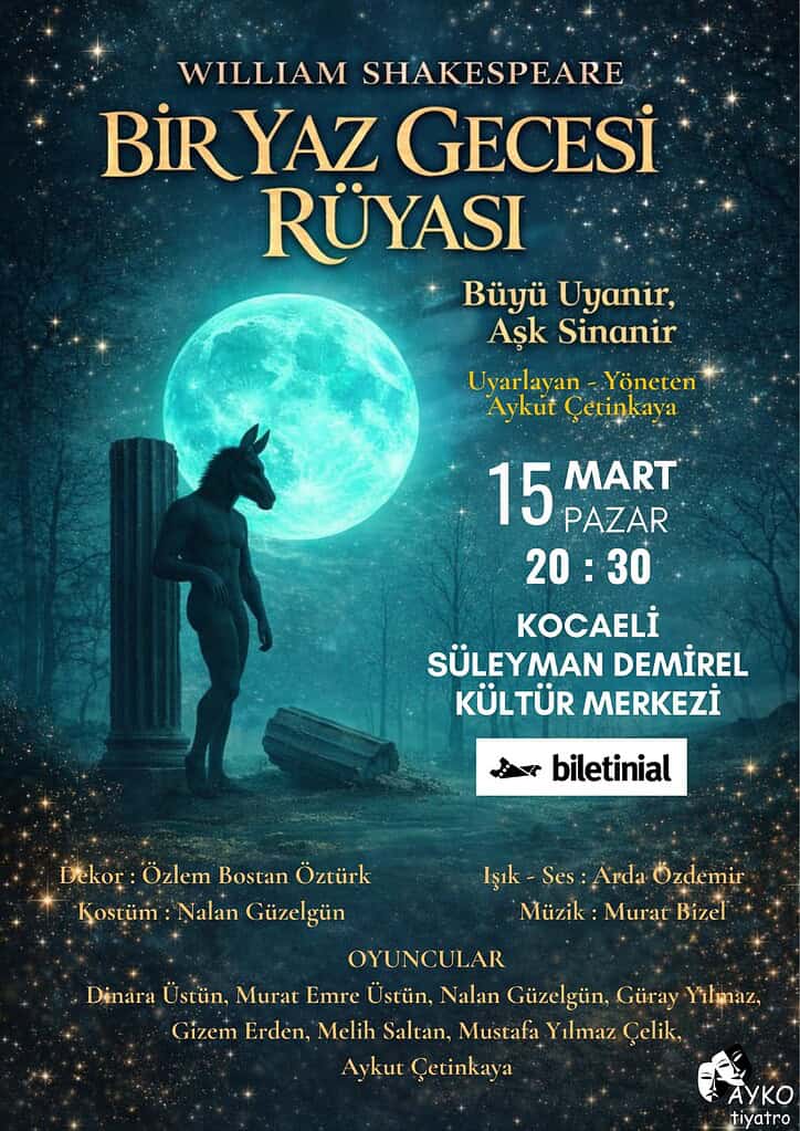 Kocaeli Süleyman Demirel Oda Tiyatrosu, 15 Mart Pazar günü Shakespeare’in klasik romantik komedisi “Bir Yaz Gecesi Rüyası” oyununa ev sahipliği yaparak seyircilere unutulmaz bir akşam vadediyor. Aşkı ve sihri ormanın derinliklerinde birleştiren Aykut Çetinkaya imzalı “Bir Yaz Gecesi Rüyası” oyunu için biletler, Biletinial üzerinden satışa sunuldu.