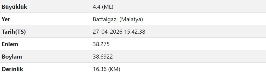 AFAD Deprem Dairesi tarafından paylaşılan verilere göre, yerin 16.36 kilometre derinliğinde gerçekleşen sarsıntı, Malatya genelinde ve çevre illerde hissedilerek kısa süreli paniğe neden oldu.