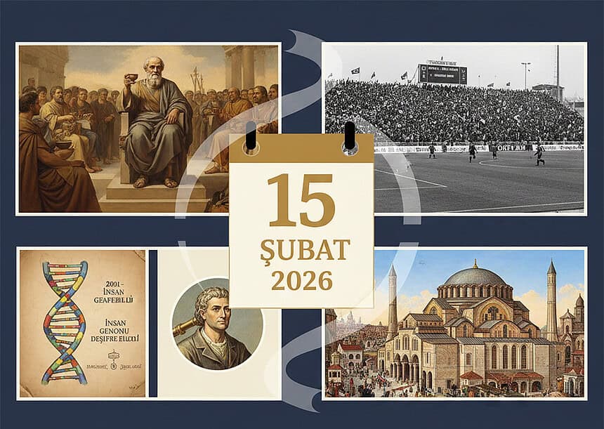 15 Şubat, Antik Çağ’da Sokrates’in düşünceleri uğruna ölüme mahkûm edilmesinden, modern tıbbın miladı sayılan insan genomunun deşifre edilmesine kadar insanlık tarihinin en kritik eşiklerine ev sahipliği yapıyor. Bugün sadece dünya tarihinin değil, Kocaeli’nin de önemli bir günü; Darıca Şehir Stadı’nın açılışı ve Ayasofya’nın ilk öncülü olan Büyük Kilise’nin kuruluşu 15 Şubat takviminde birleşiyor.