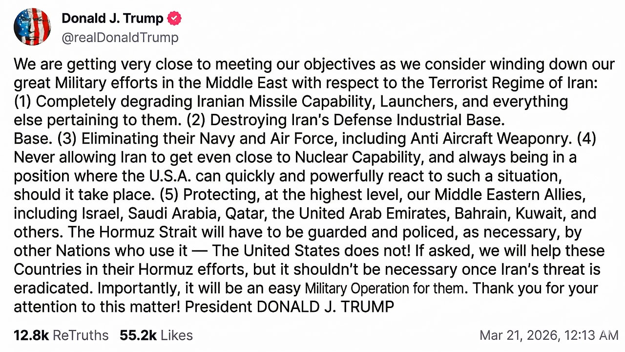 Hürmüz Boğazı’nın güvenliği konusunda radikal bir politika değişikliğine işaret eden Trump, boğazın artık ABD tarafından değil, onu kullanan bölge ülkeleri tarafından korunması ve denetlenmesi gerektiğini savundu. Talep edilmesi halinde müttefiklerin bu çabalarına yardımcı olunabileceğini ancak İran tehdidi ortadan kaldırıldığında buna gerek kalmayacağını kaydeden Trump, müttefik ülkeler için bu sürecin “kolay bir askeri operasyon” olacağını vurgulayarak sözlerini noktaladı.