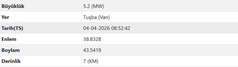 Afet ve Acil Durum Yönetimi Başkanlığı (AFAD), Van’ın Tuşba ilçesinde 5.2 büyüklüğünde şiddetli bir depremin meydana geldiğini bildirdi.